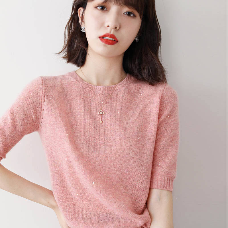 2024春夏季新款女装超柔亮片宽松上衣中袖针织衫套头圆领打底衫女