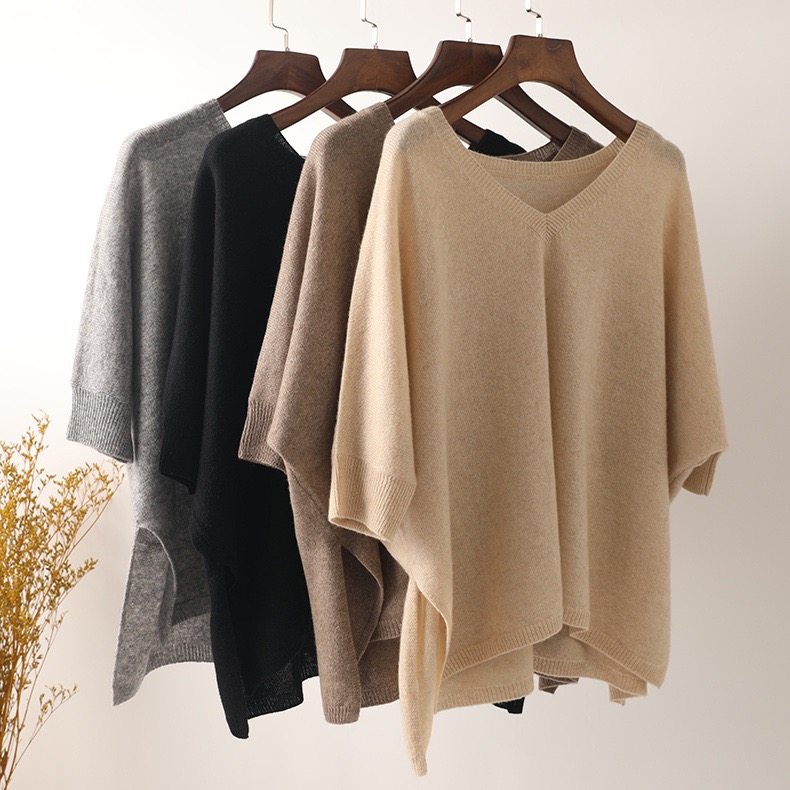 夏季V领短袖100羊绒针织衫女薄宽松套头百搭五分袖打底衫洋气上衣