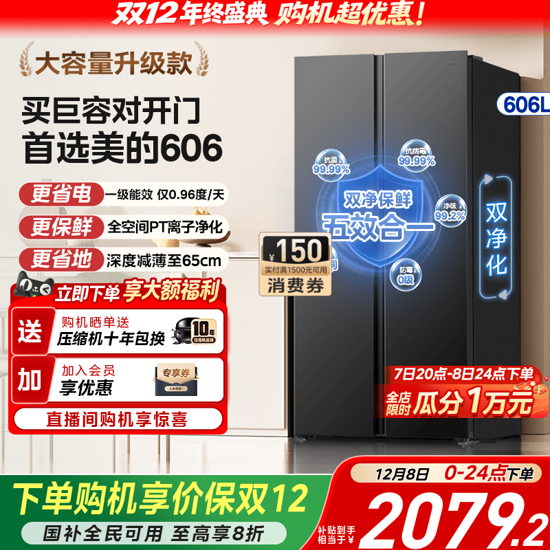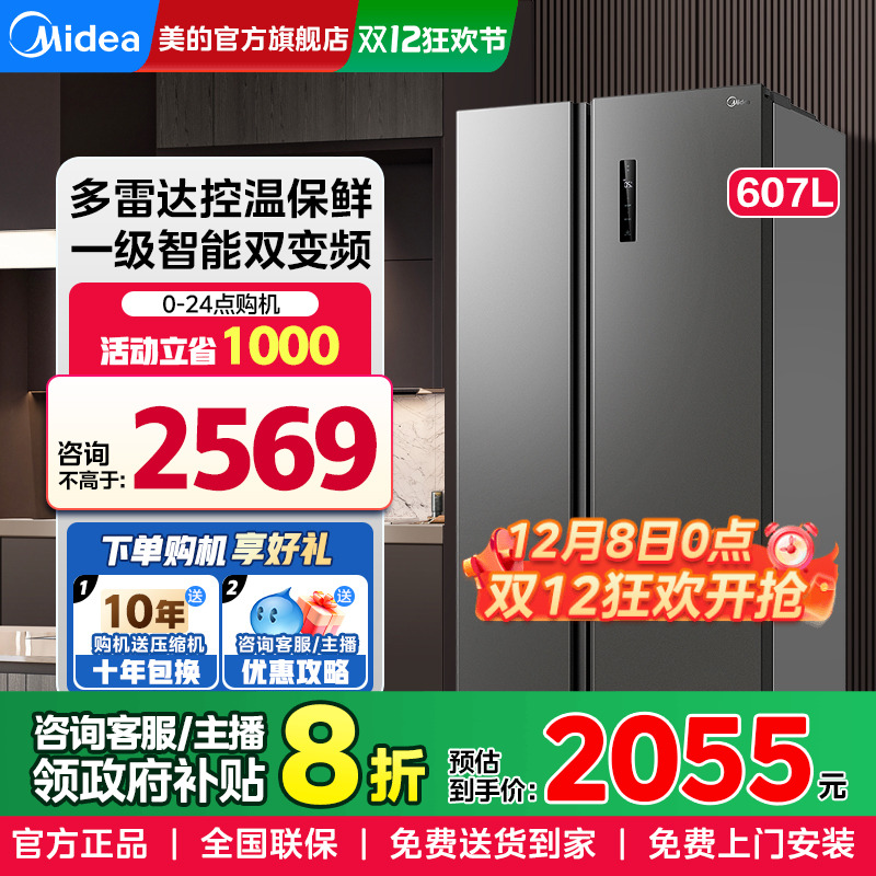 美的607L对开双开门大容量风冷无霜一级能效家用电冰箱官方旗舰店