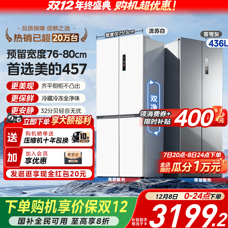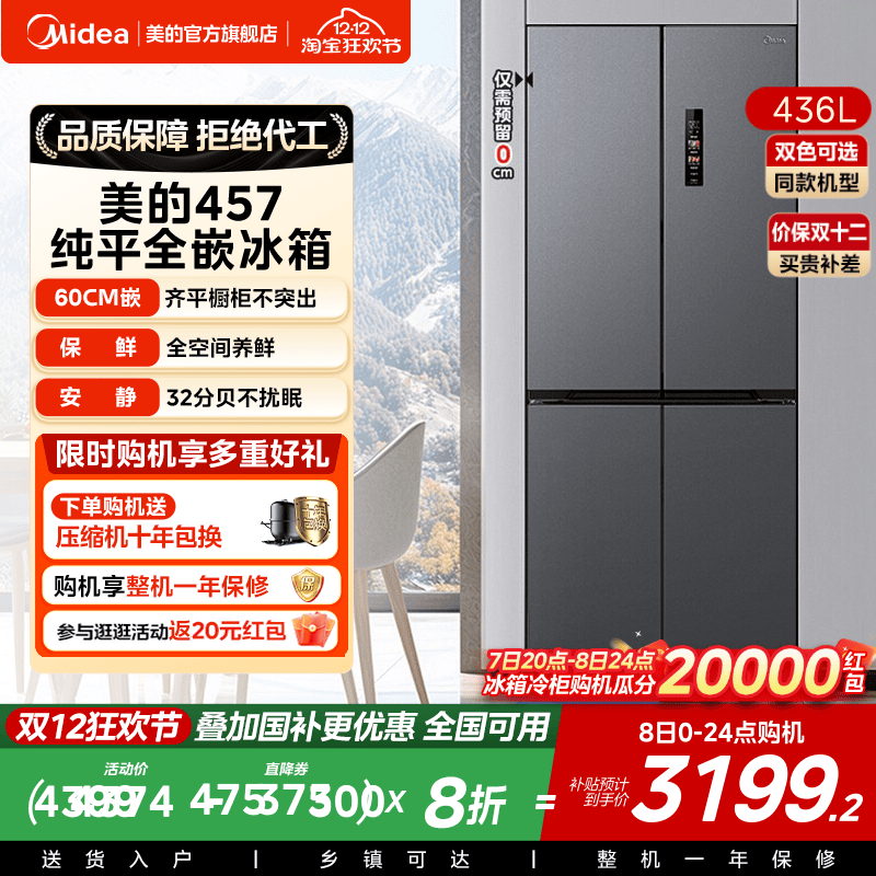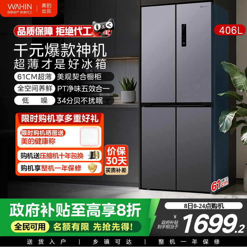 美的480L十字双开四门大容量一级风冷无霜薄嵌入家用冰箱换新补贴