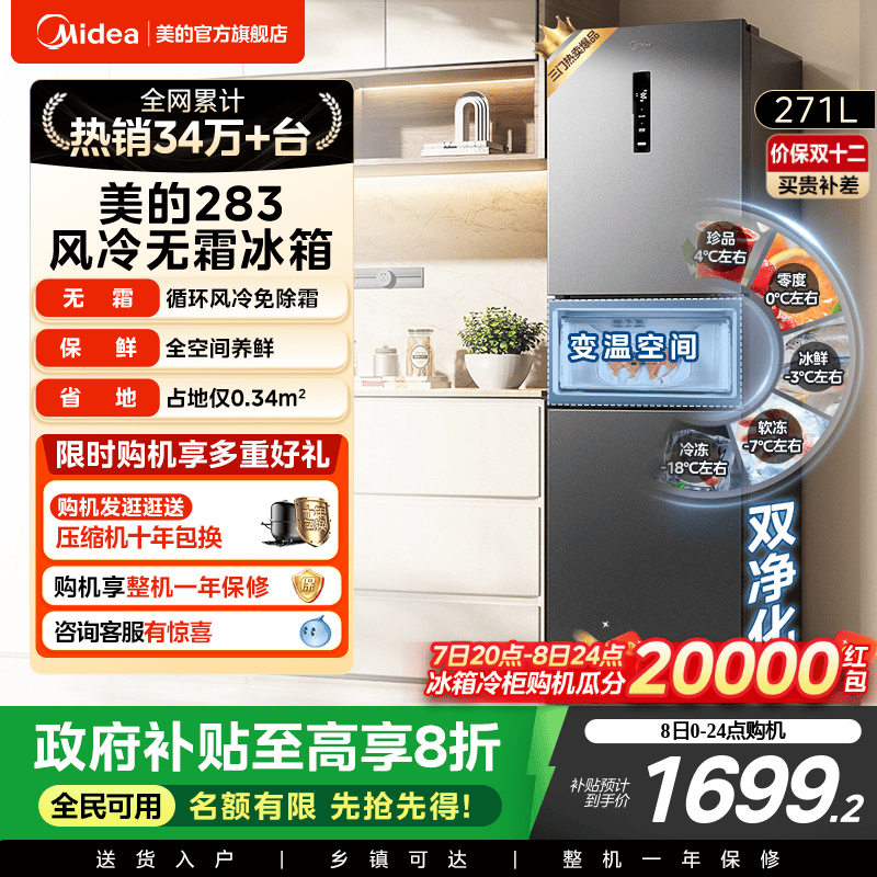 美的283三开门风冷无霜家用小型租房宿舍用变频一级能效电冰箱