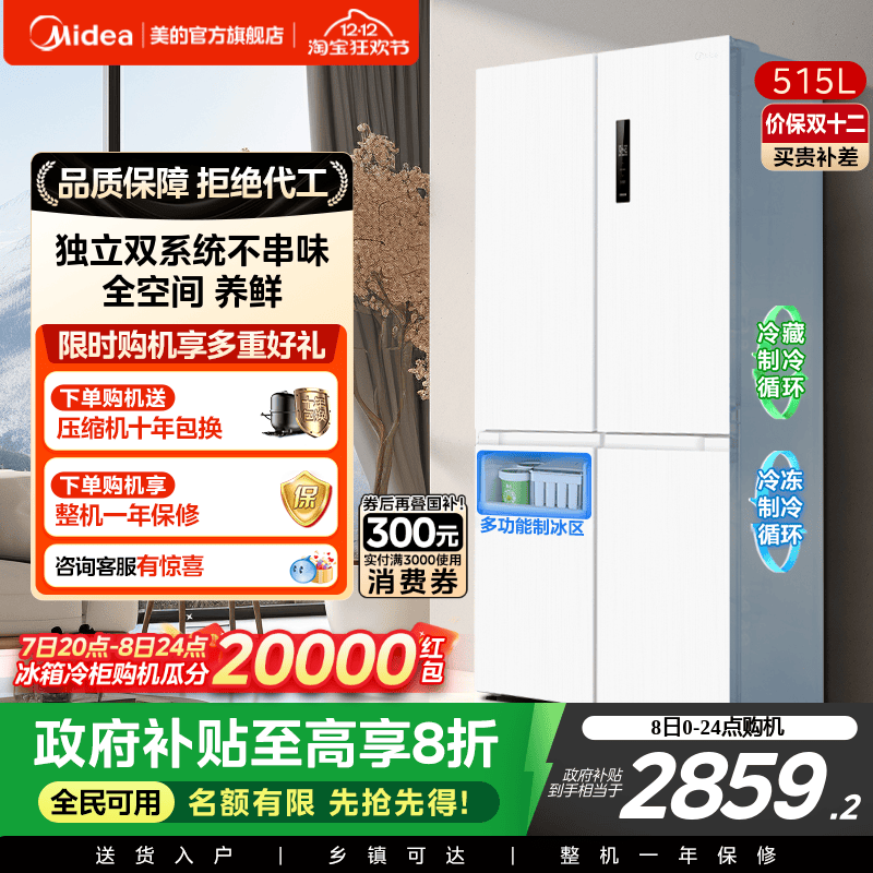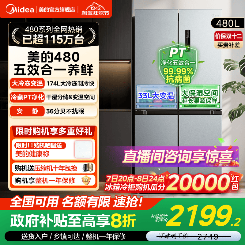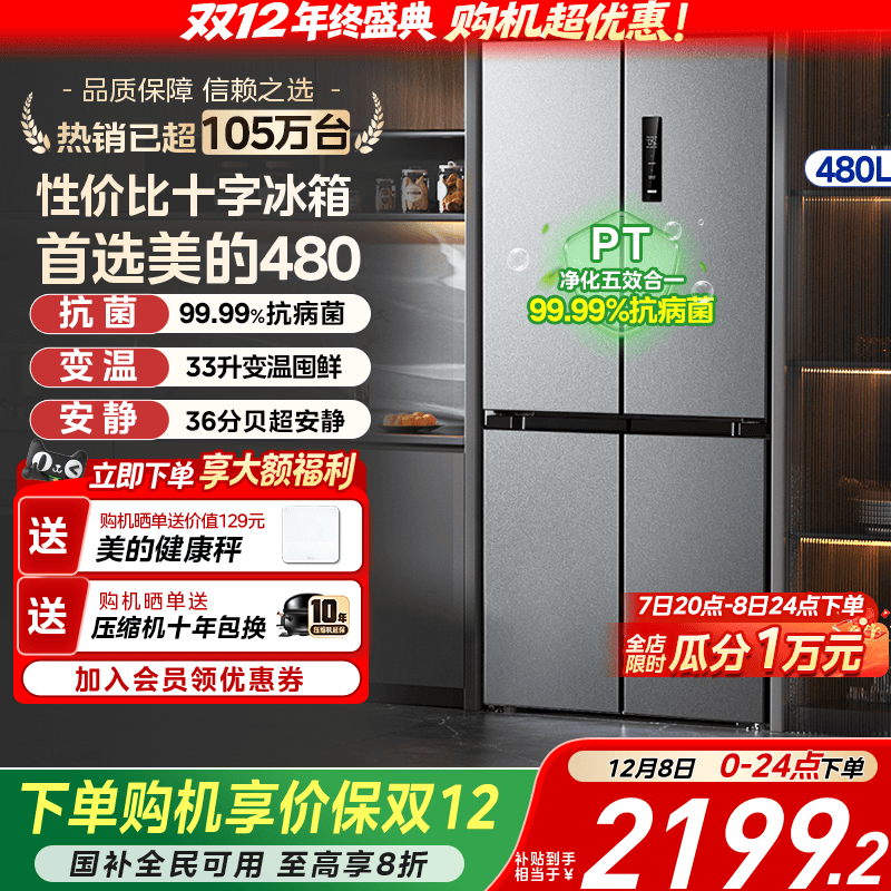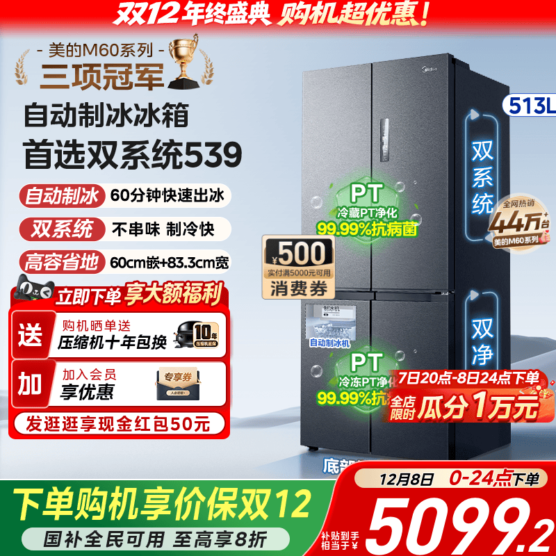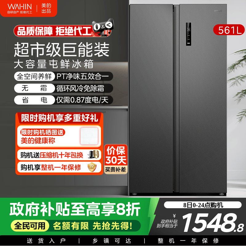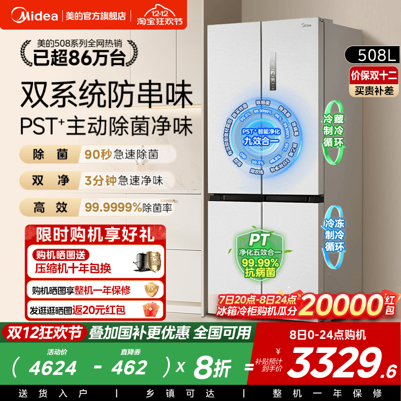 美的新品508L双系统循环净味除菌家用冰箱十字四门风冷换新补贴
