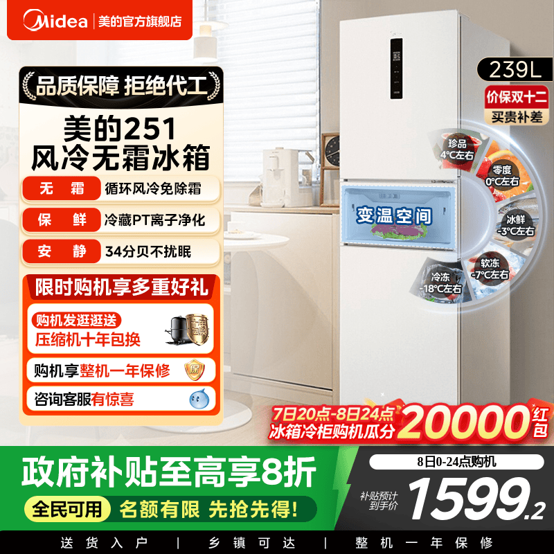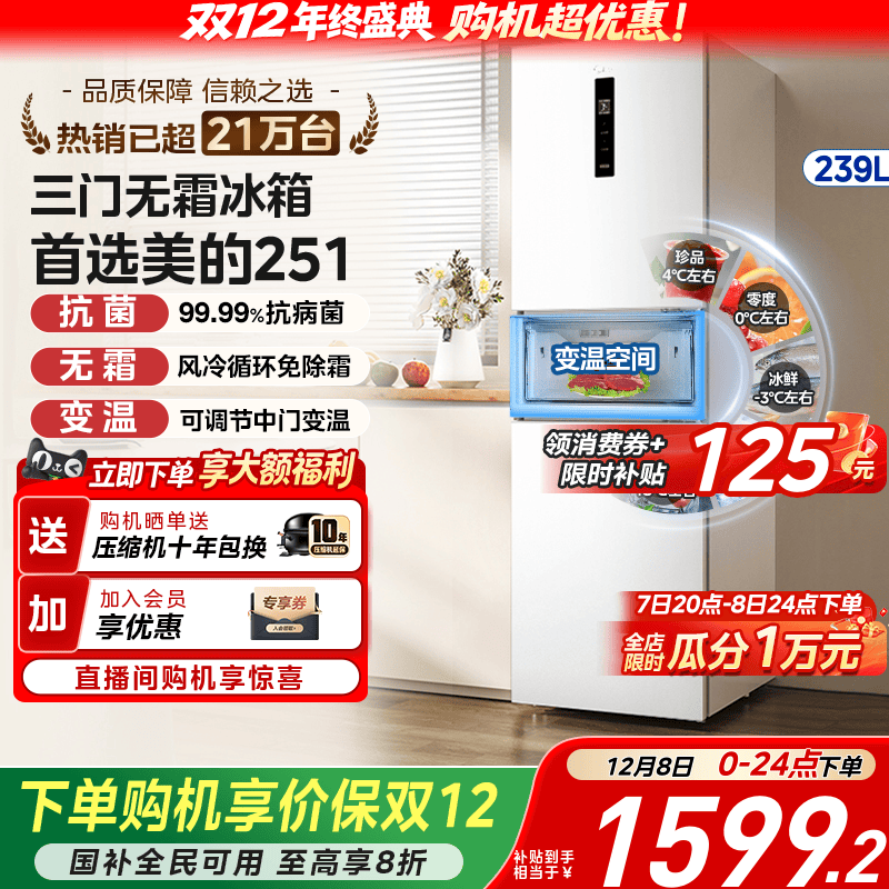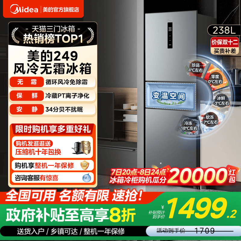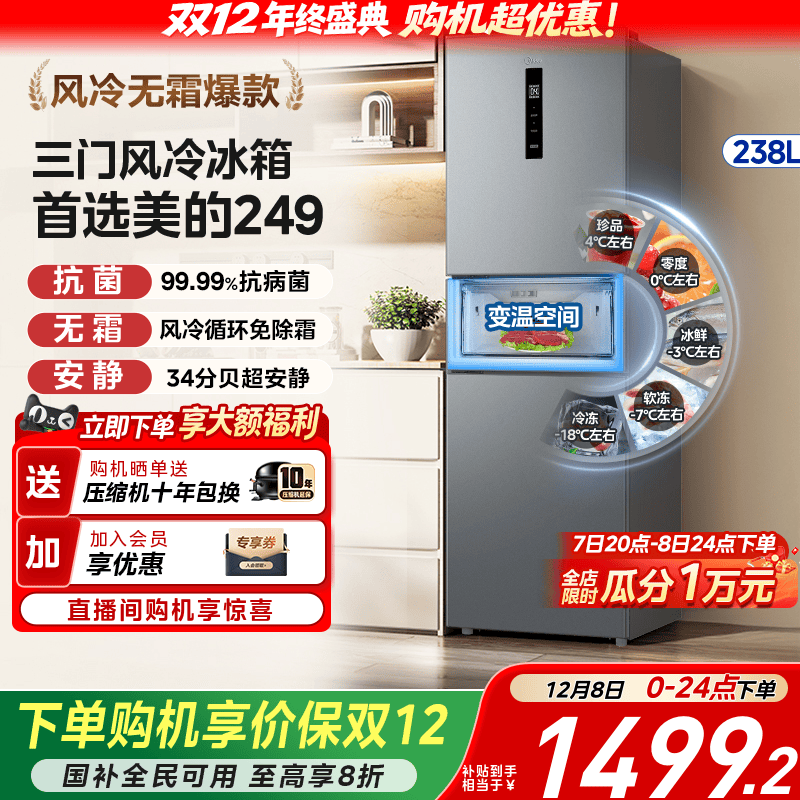 政府换新补贴美的249三门电冰箱风冷无霜变频一级能效家用小型