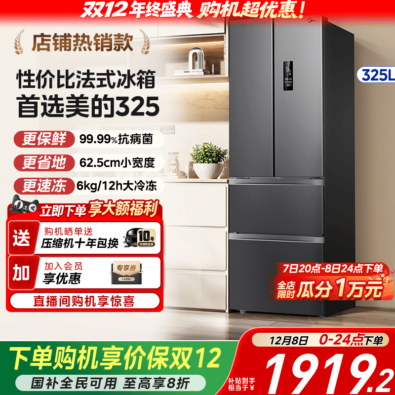 美的325升法式双开四门电冰箱家用一级能效小户型出租房风冷无霜