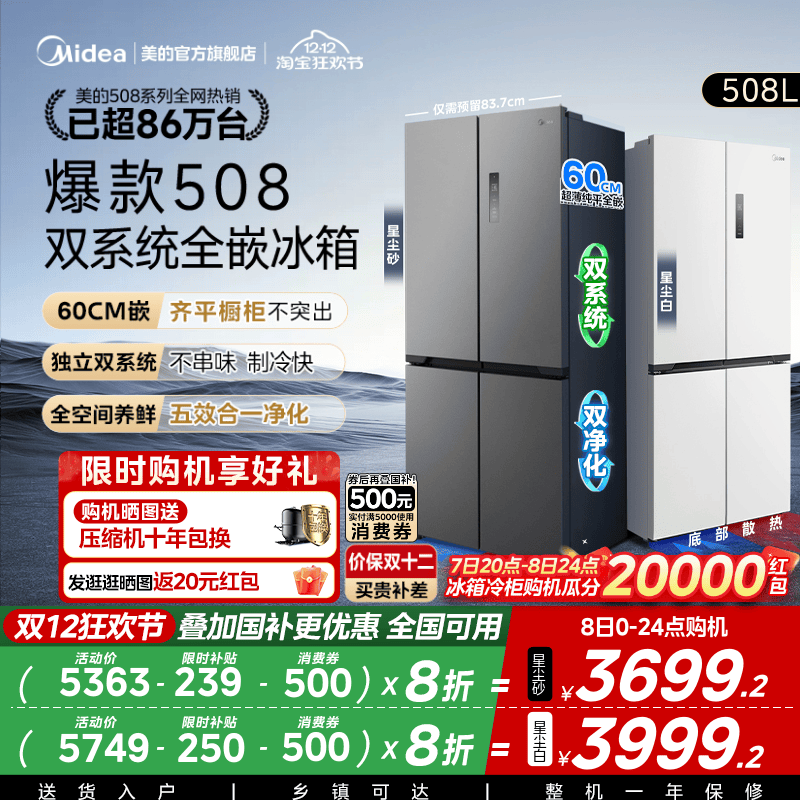 【双系统】美的508超薄零嵌入式冰箱十字双开四门家用大容量风冷