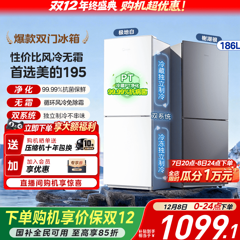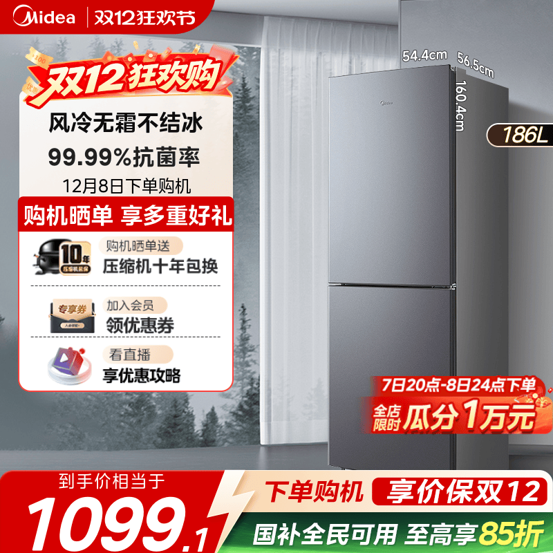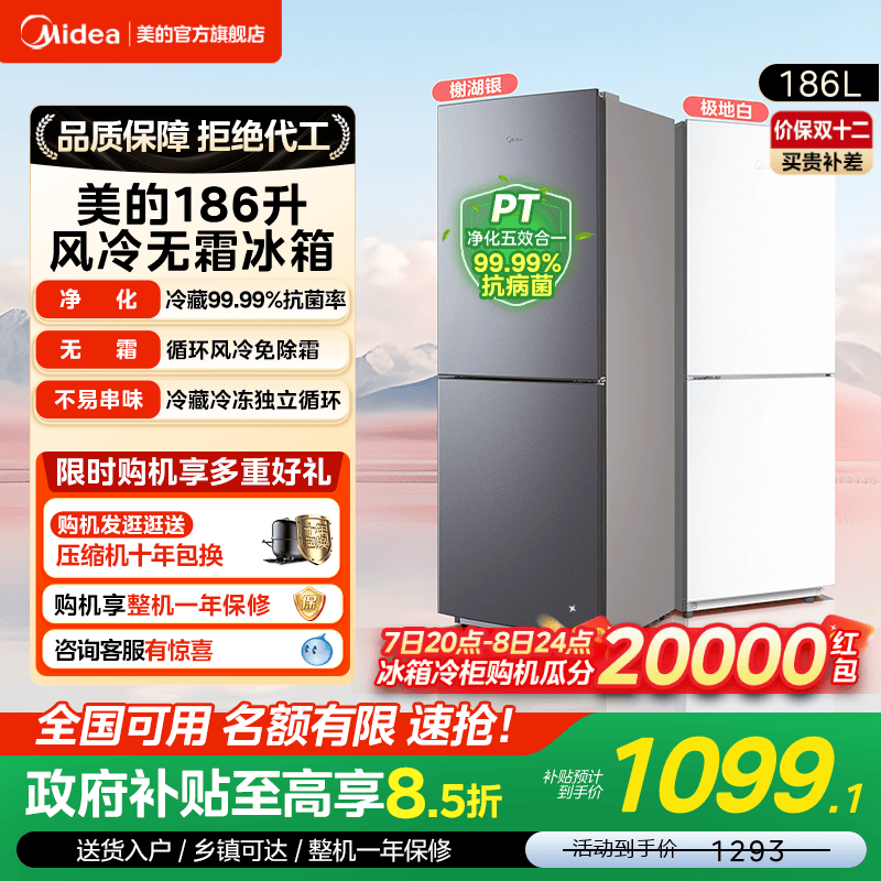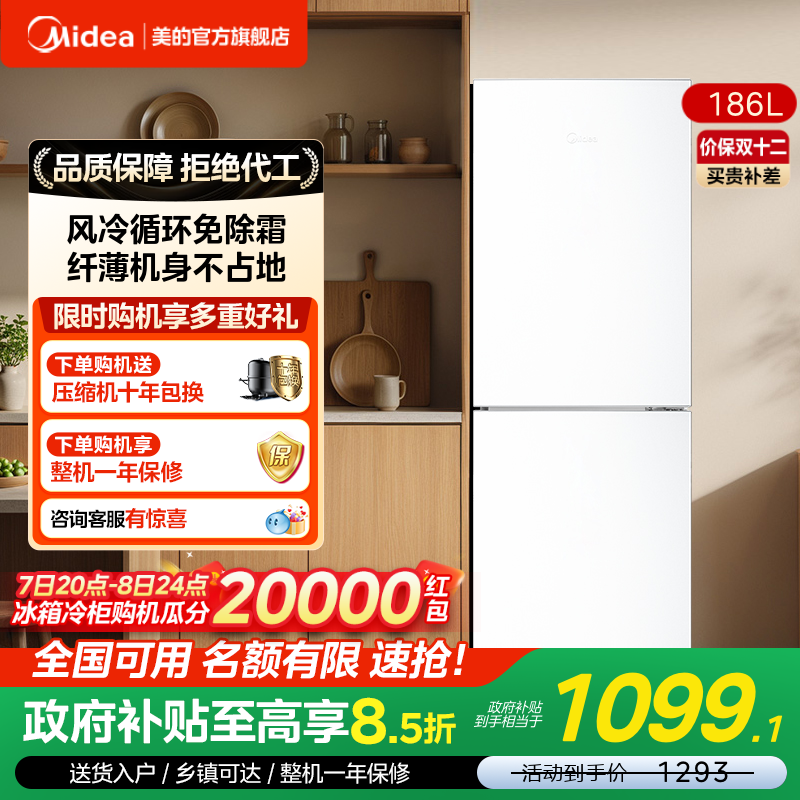 【政府补贴】美的186升风冷无霜双门两门家用冰箱小户型宿舍租房
