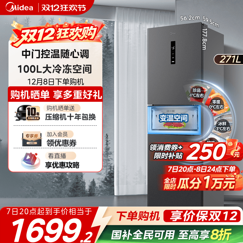 【政府换新补贴】美的249三门冰箱一级能效风冷无霜家用租房宿舍