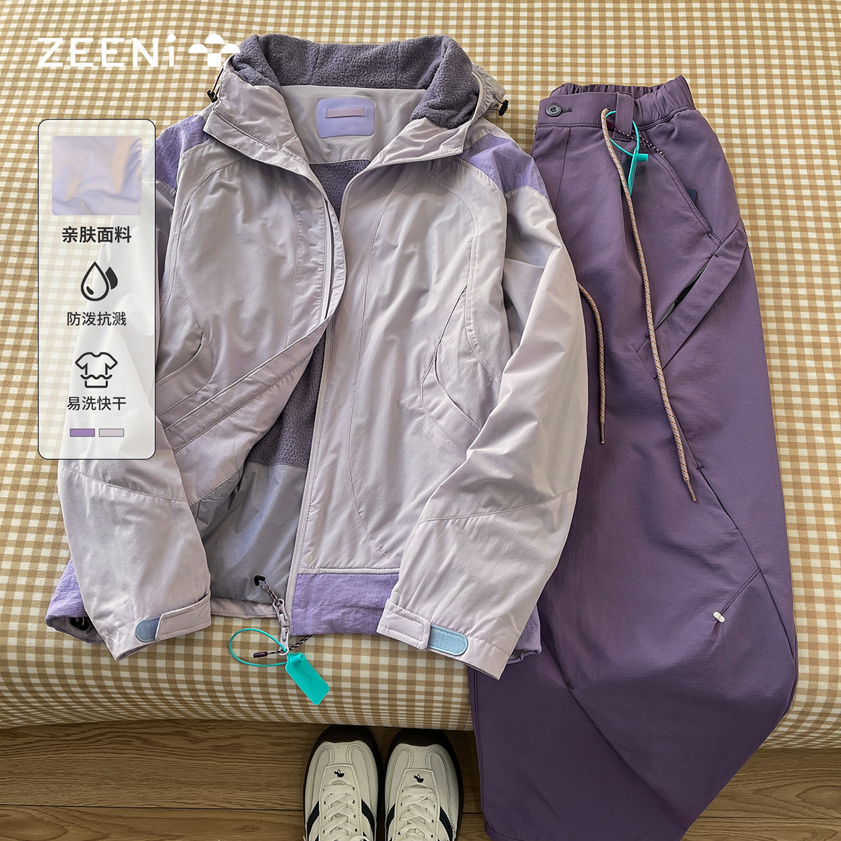 ZEENI 户外撞色紫色冲锋衣外套女小个子休闲裤运动登山爬山套装