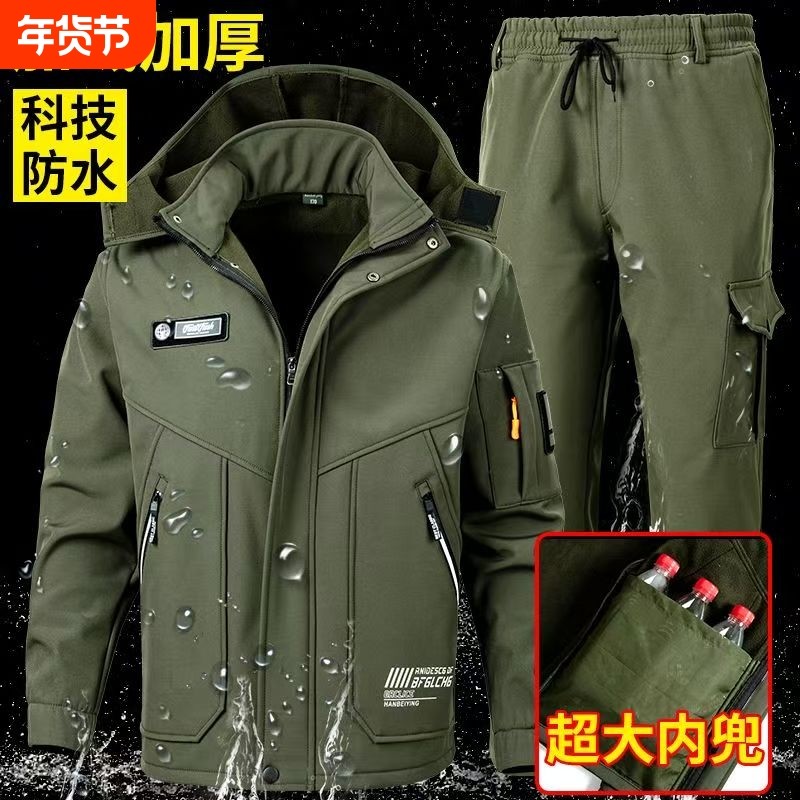 秋冬加绒加厚冲锋衣套装一整套男女防风防泼水户外防寒保暖工作服
