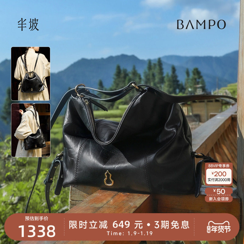 BAMPO半坡绵绵双肩包背包 头层牛皮托特包新款质感单肩hobo报喜包