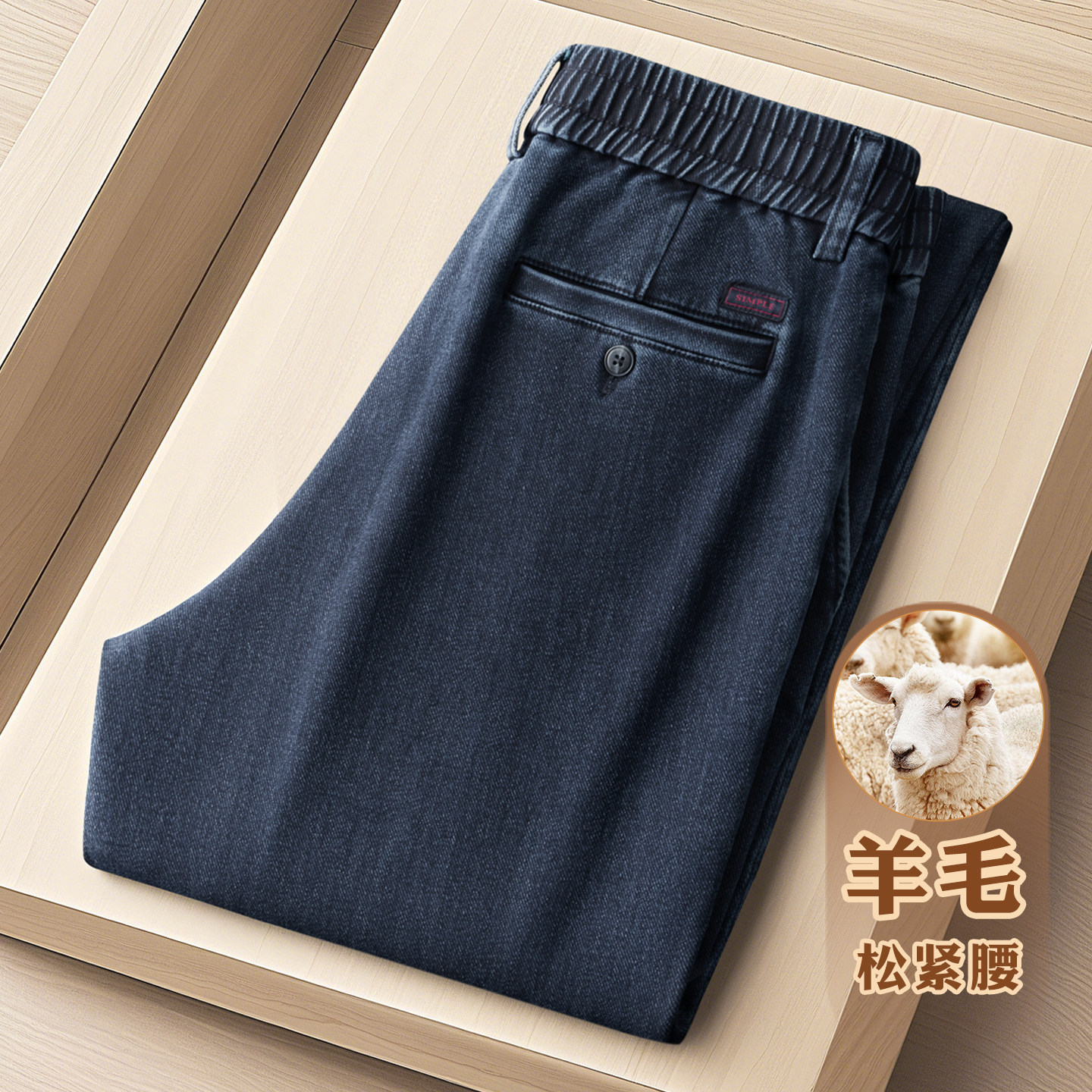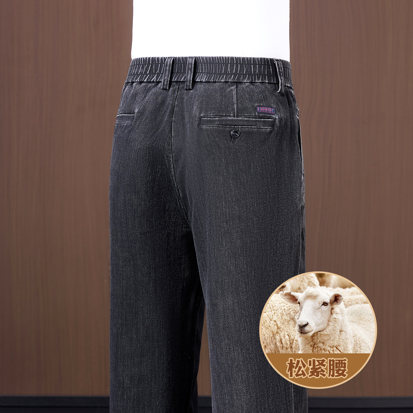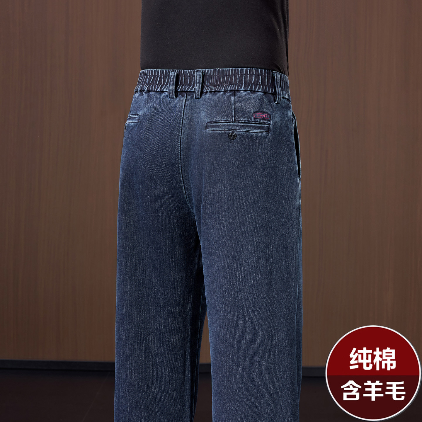 羊毛+棉 秋冬款松紧腰男士牛仔裤宽松直筒中年冬季加绒休闲男裤子