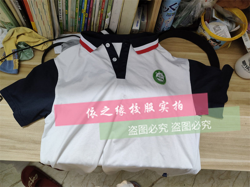 古竹中学校服夏纯棉短袖t恤POLO衫上衣白色拼藏青色大码定制班服