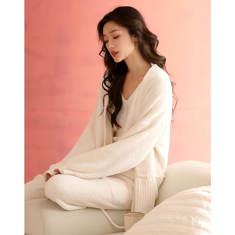 女士睡衣秋冬季加厚保暖半边绒白色家居服冬天珊瑚绒性感三件套装