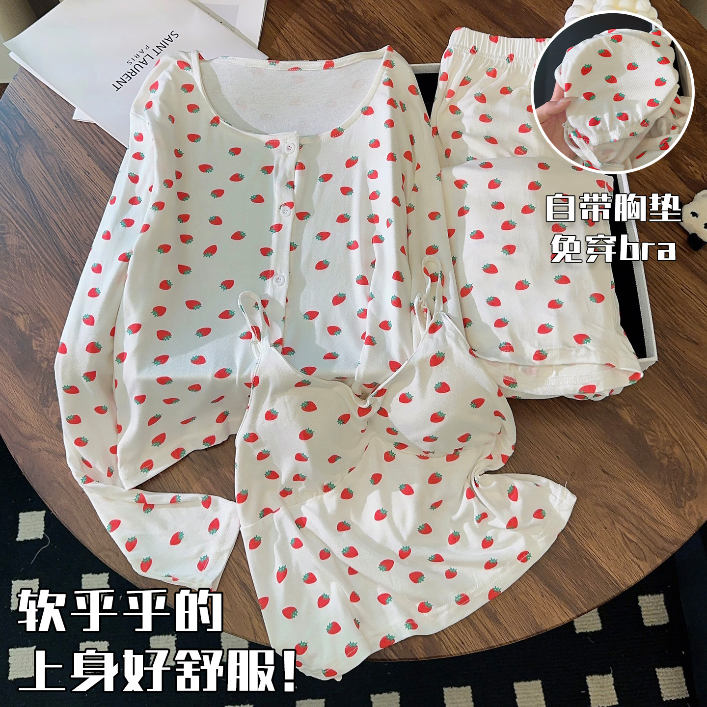 草莓睡衣女士春秋季长袖莫代尔三件套装秋冬天带胸垫可外穿家居服