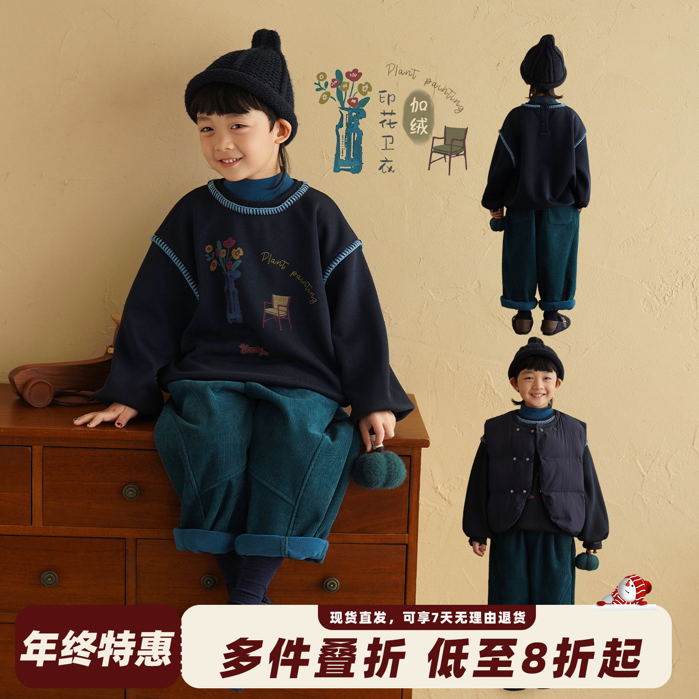 砚台家儿童加绒卫衣套装秋冬款童装男童长袖衬衫马甲萝卜裤三件套