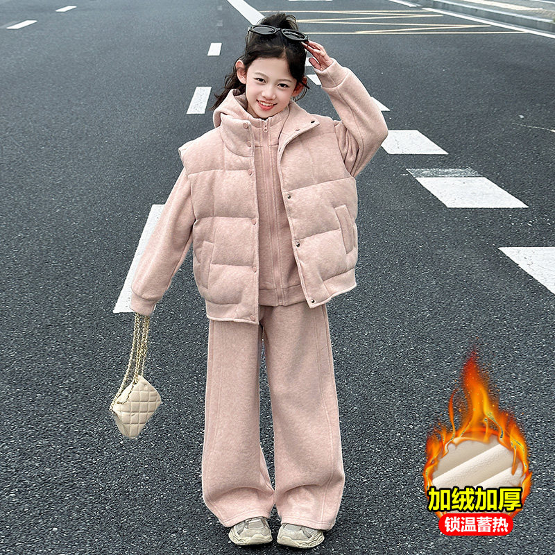 女童秋冬加绒卫衣外套运动套装洋气中大童羽绒棉马甲加厚三件套潮