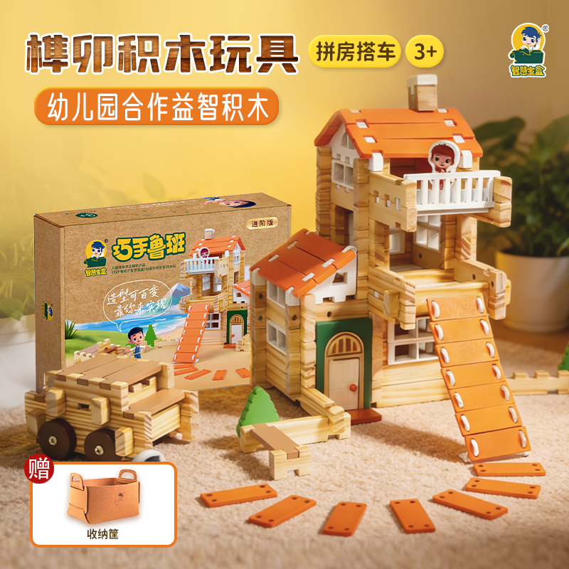 巧手鲁班榫卯结构积木玩具实木头大颗粒木块房子车子男女儿童礼物