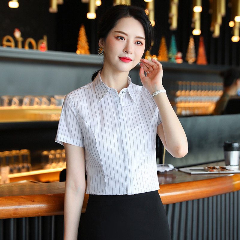 白色条纹衬衫女夏季新款纯棉内搭短袖职业衬衣酒店前台服务员工装