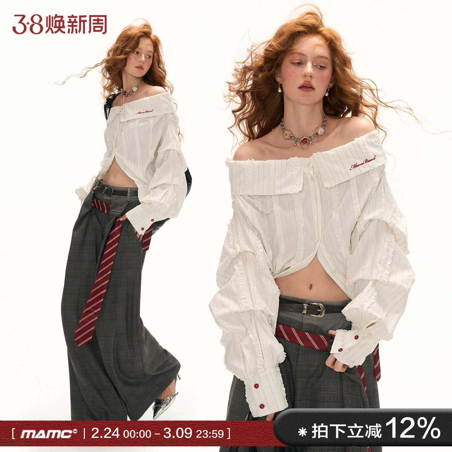MAMC大V层次条纹白色衬衫女2025秋季新款一字肩衬衣宽松长袖上衣