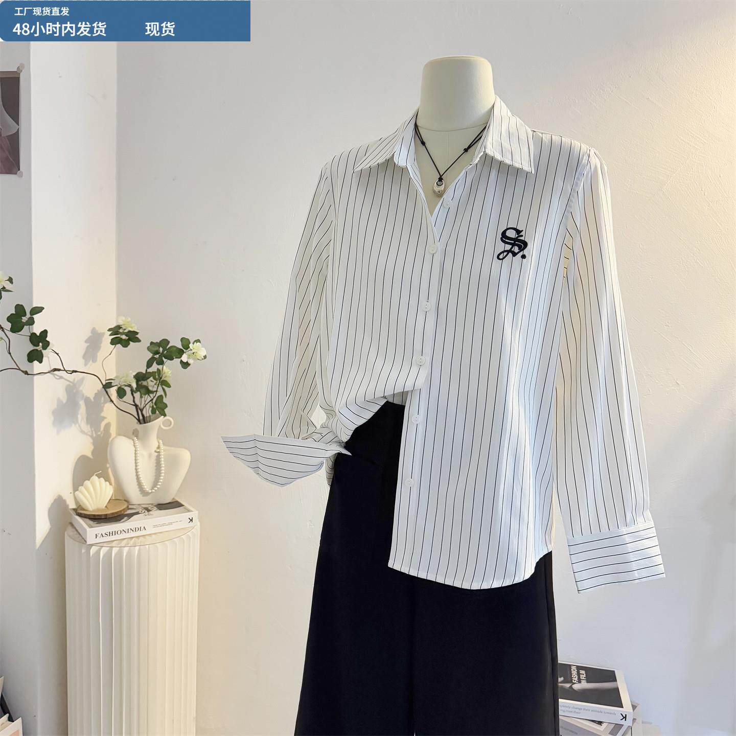 今屿花花女士早秋新款上衣刺绣白色条纹衬衫女2025新款设计感宽松