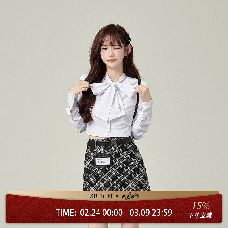 花铃太太衬衫女2026春秋款白色短款条纹长袖蝴蝶结小个子时尚休闲