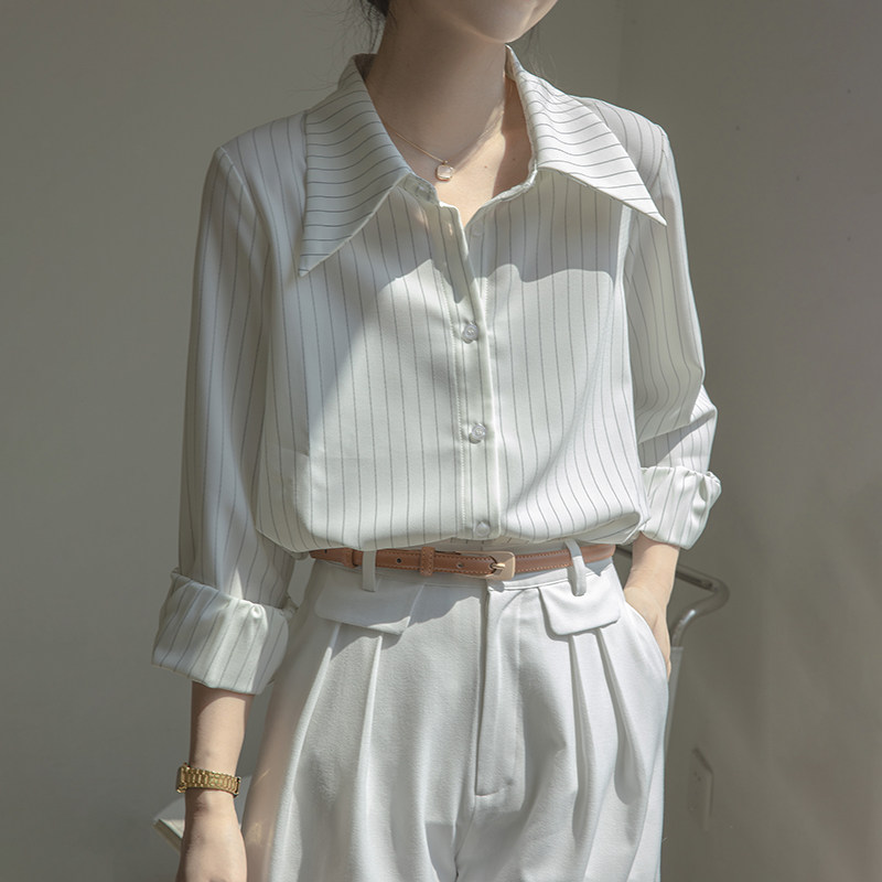 法式慵懒风白色条纹衬衫女春款长袖翻领宽松显瘦百搭上衣洋气衬衣