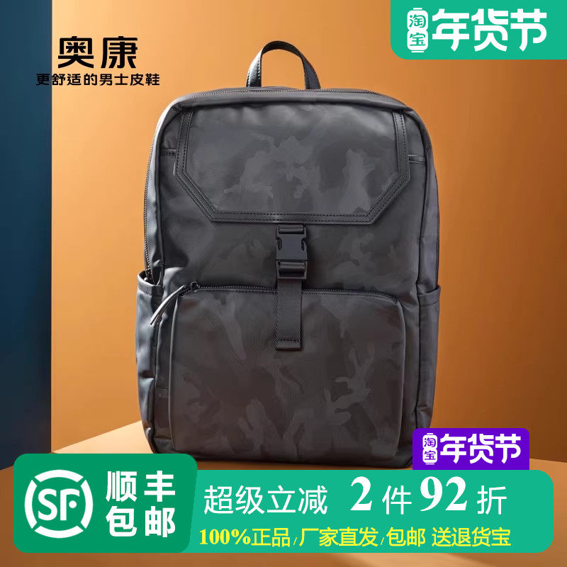 奥康男包大容量迷彩双肩包时尚竖款大学生电脑包休闲双肩背包书包