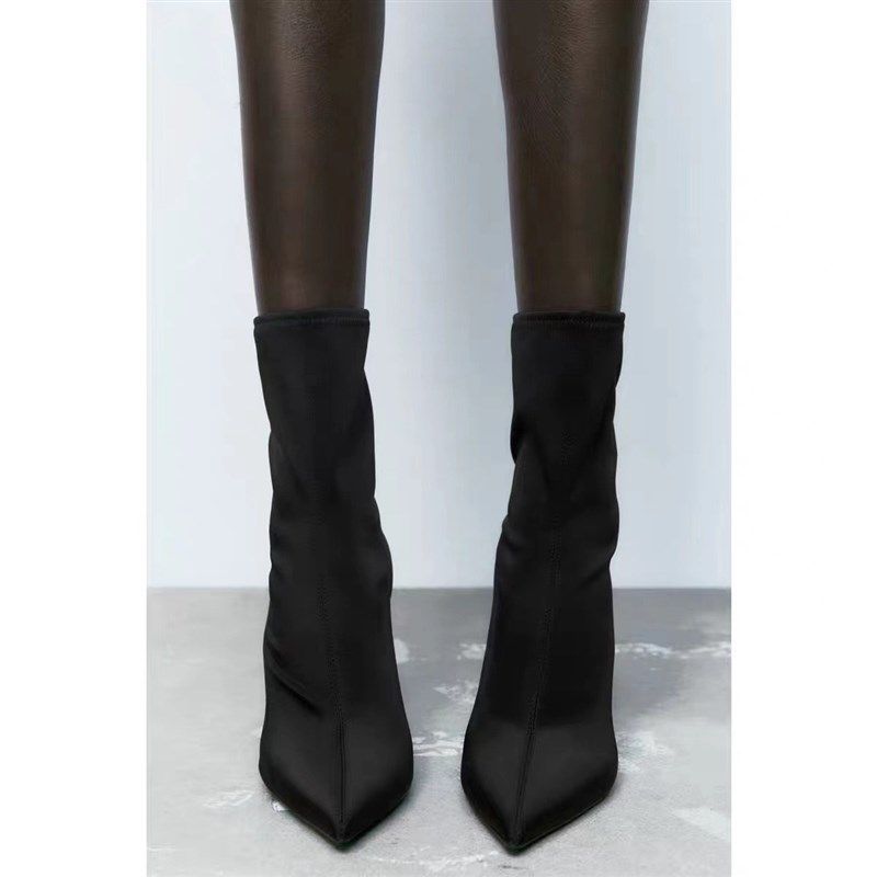 ZA家原单尾货2025秋季新品 女鞋 黑色易于拉穿高筒套筒尖头猫跟靴