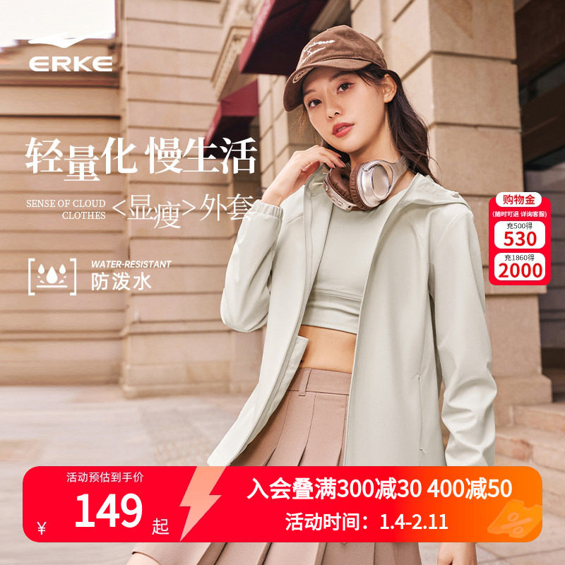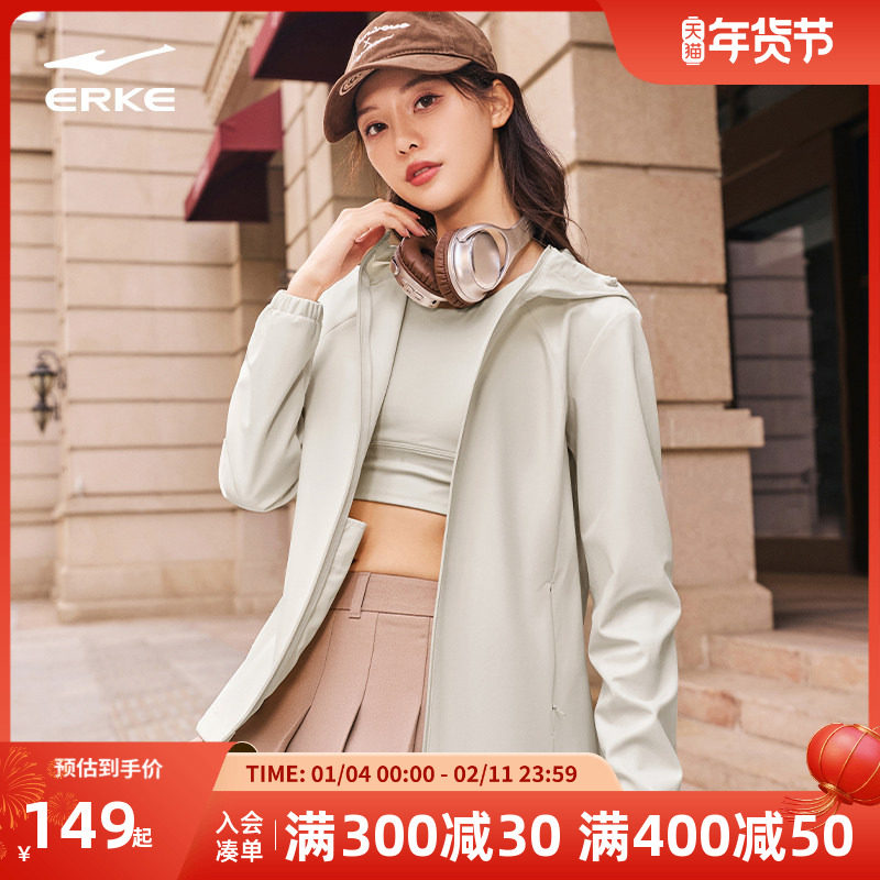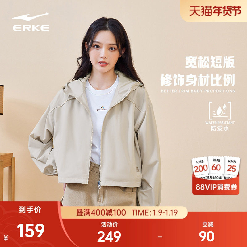 鸿星尔克外套女2025春季新款女士防泼水防风衣连帽夹克运动服女装