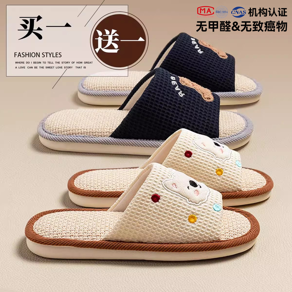 买1送1亚麻拖鞋室内家居女款夏季情侣一对家用静音棉麻凉拖男夏天