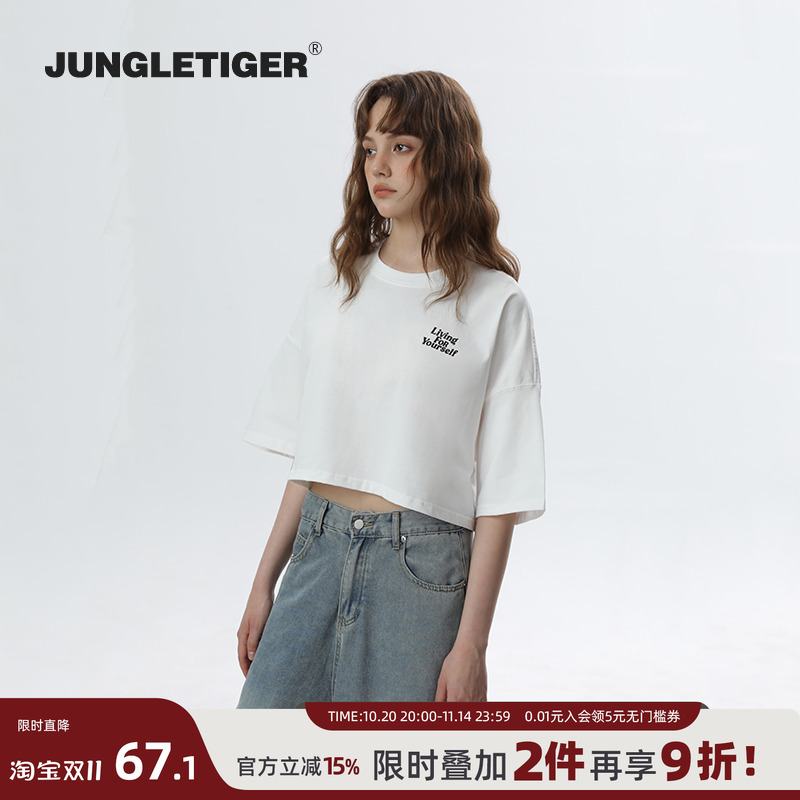 丛林老虎美式嘻哈短款露脐短袖T恤女夏季街头辣妹宽松落肩袖上衣