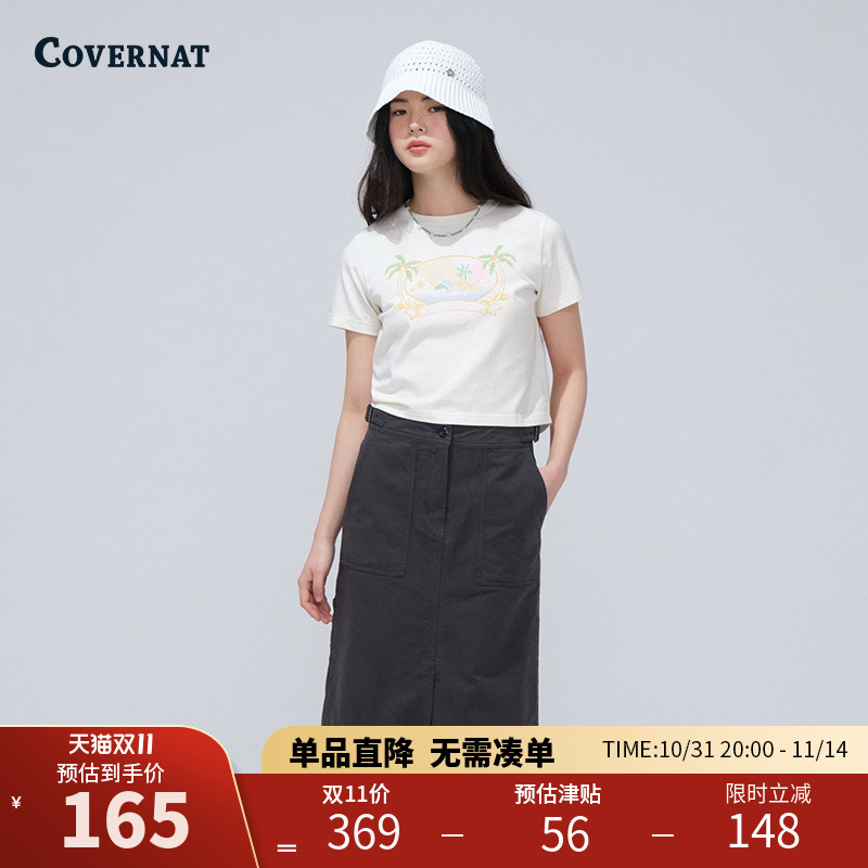 covernat韩国潮牌休闲女士露脐时尚沙滩图案宽松T恤显瘦短袖春