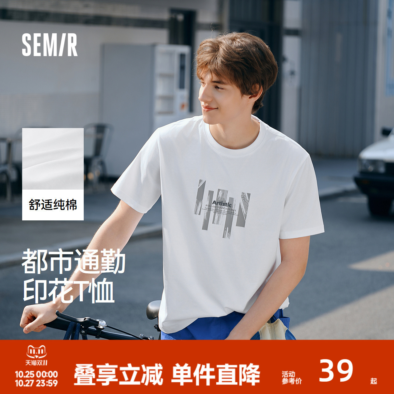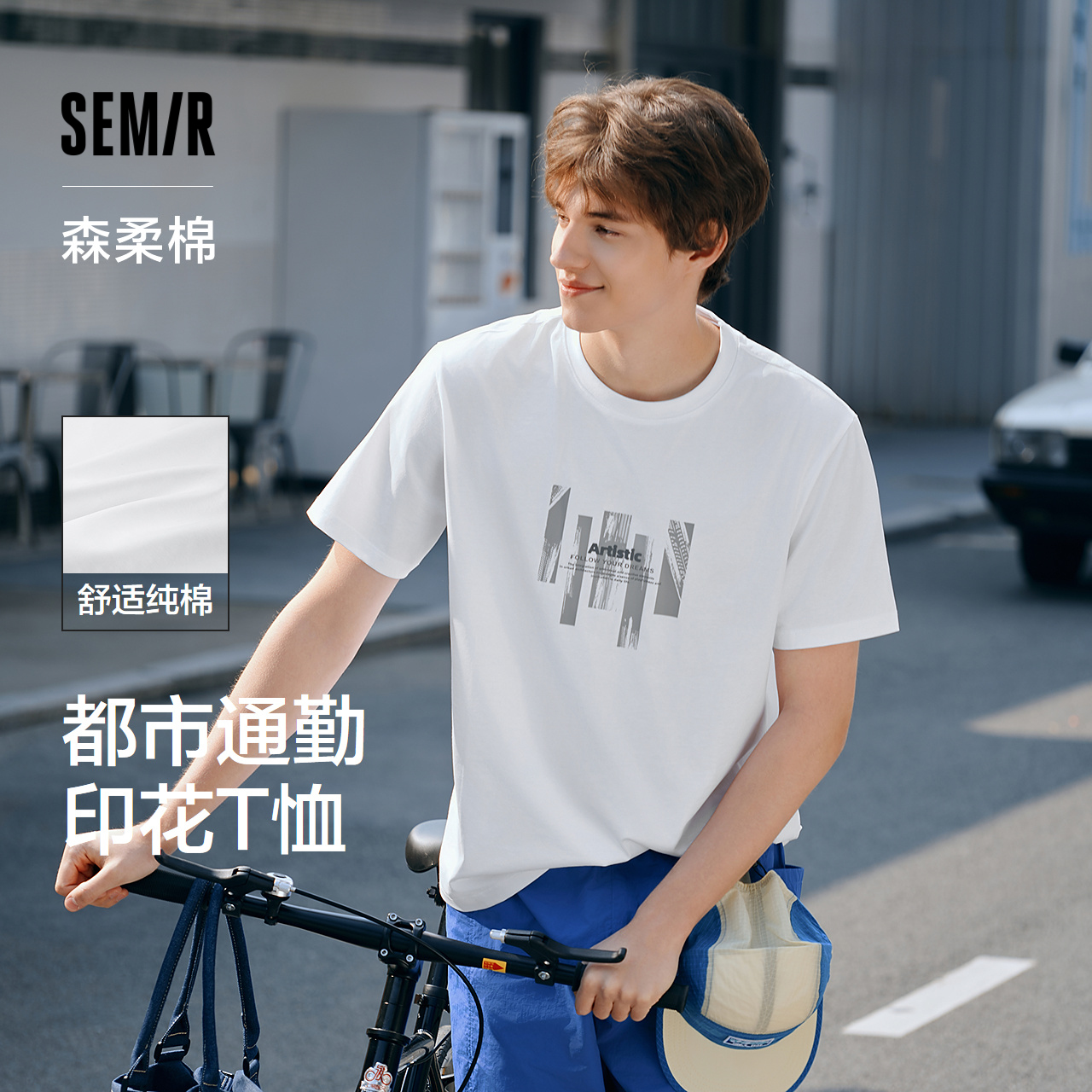 森柔棉|森马短袖T恤男纯棉夏装都市通勤印花正肩上衣时尚圆领白t