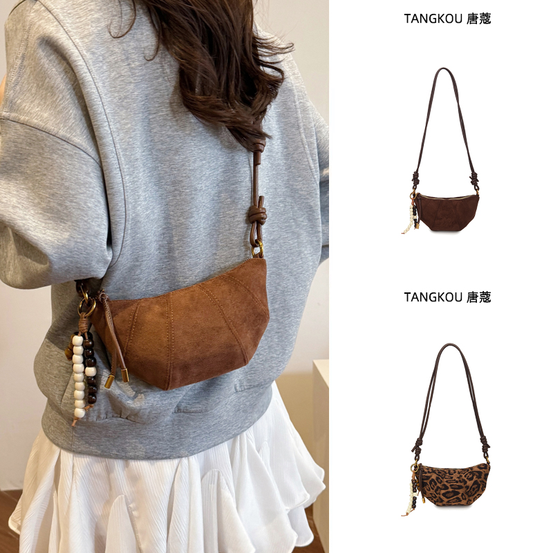 日韩豹纹饺子包女2025新款麂皮绒斜挎小包休闲通勤挎包小众牛角包