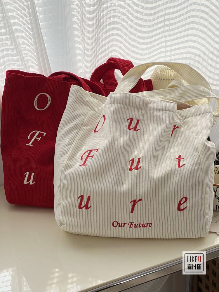 原创设计加厚日韩灯芯绒字母刺绣通勤学生单肩托特文艺休闲包袋女