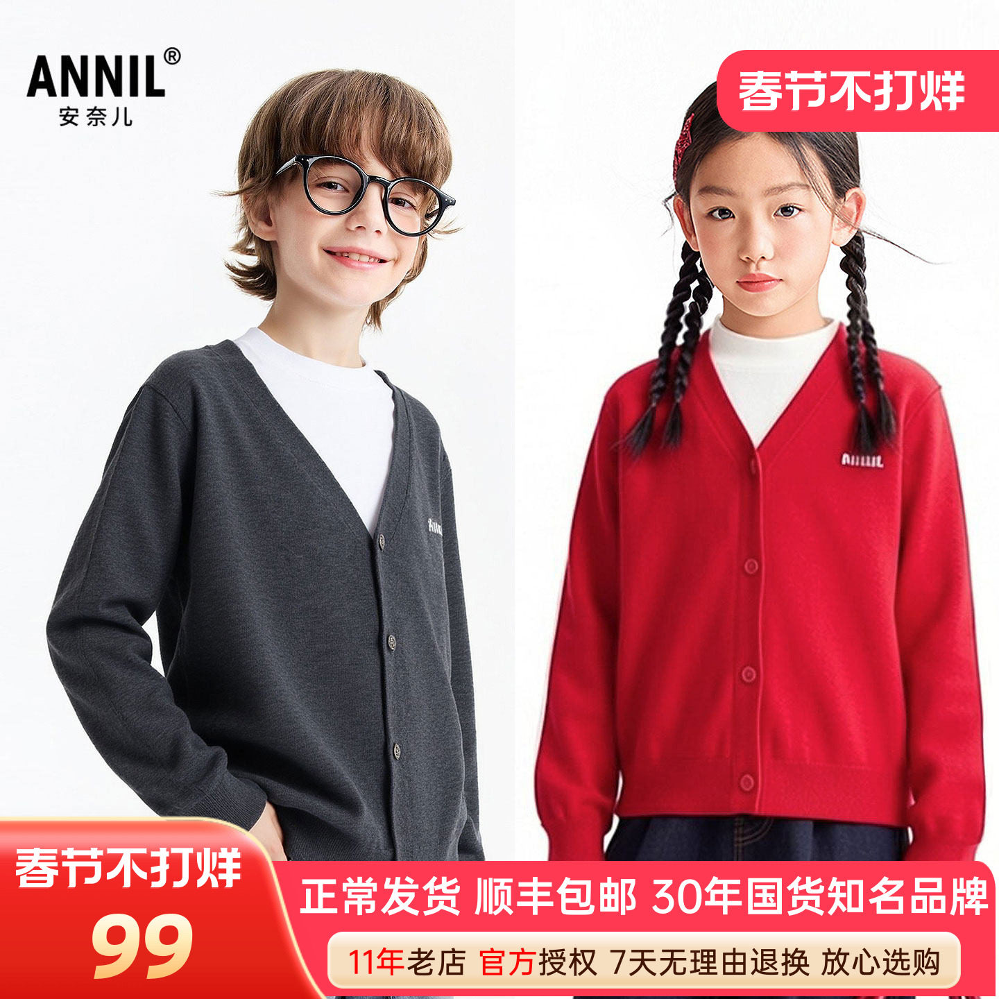 安奈儿男女童装针织V领开衫毛衣2026春新款休闲薄外套红色新年服