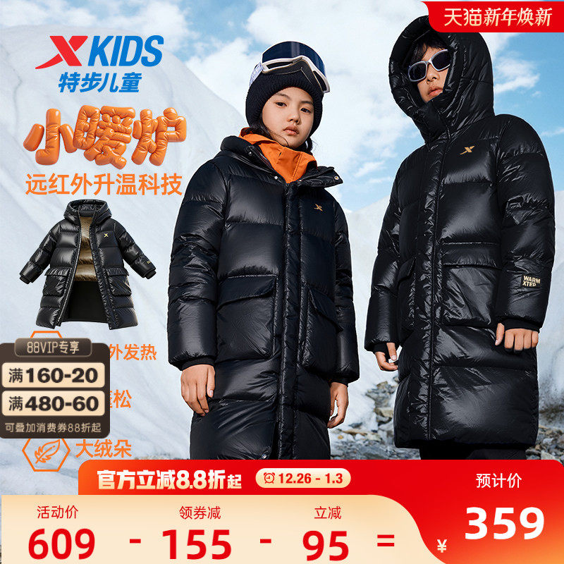 特步童装儿童亮面保暖羽绒服男童中长款加厚外套2025秋冬新款冬装