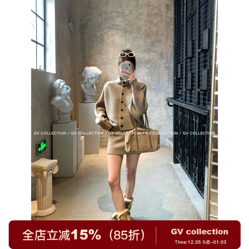 松弛慵懒感毛衣套装秋冬纯欲系扣V领修身针织衫高腰半身裙两件套