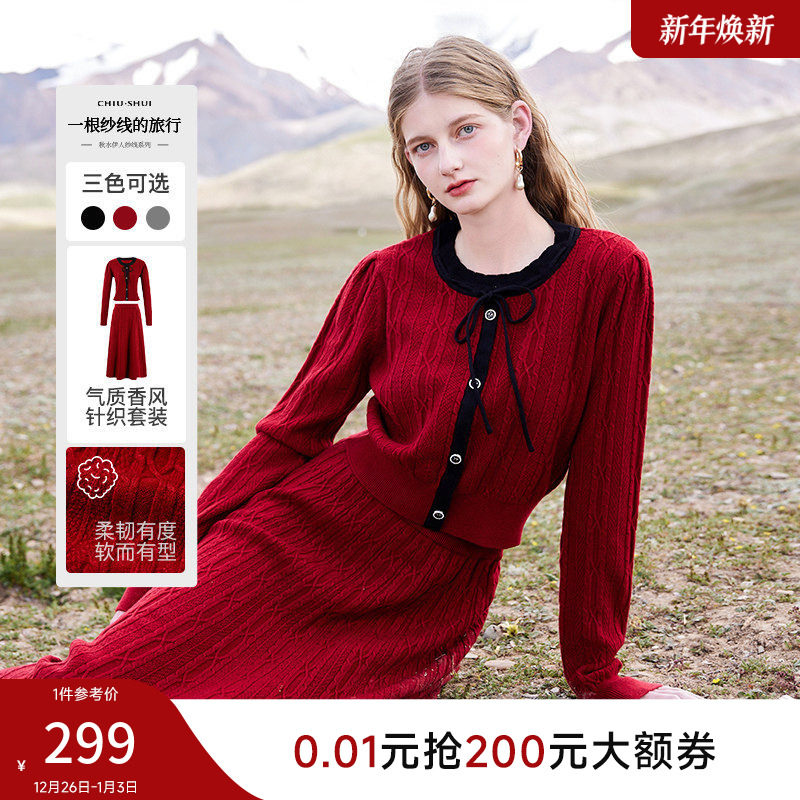 秋水伊人温柔红色针织套装2025秋冬新款装圆领上衣半身裙两件套