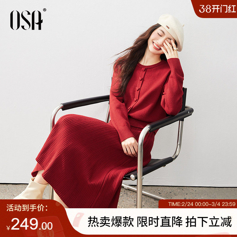OSA欧莎针织套头衫+半身裙两件套女冬新款通勤新年红色氛围感套装