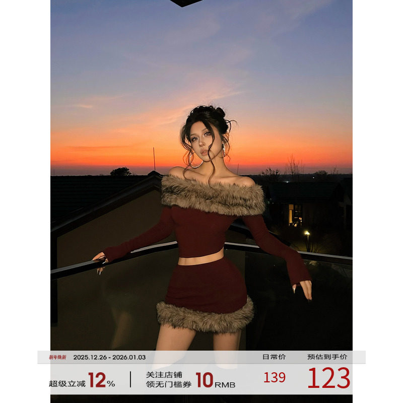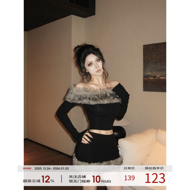 福尔尼斯悦 辣妹针织套装2025冬季毛领拼接一字肩上衣半裙两件套