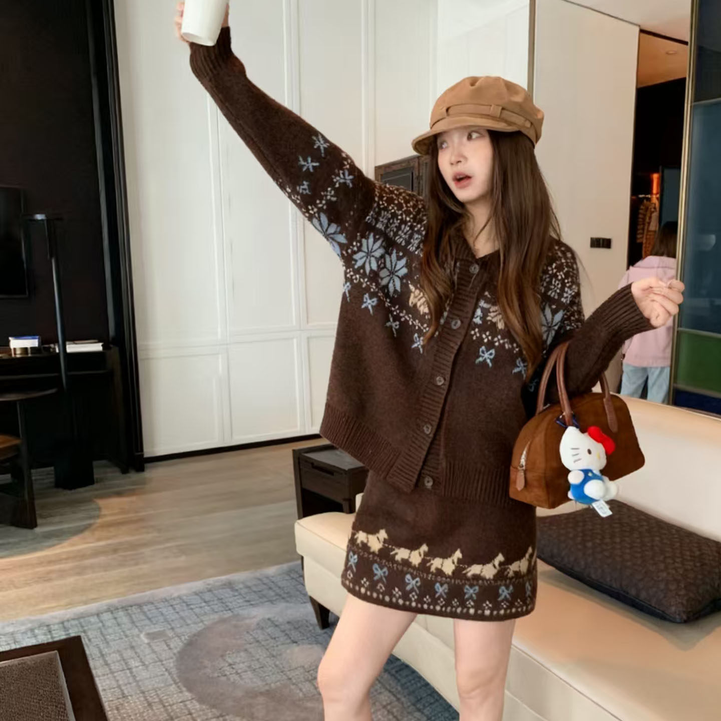 港风复古费尔岛提花针织套装秋冬新款高级感气质毛衣半身裙两件套