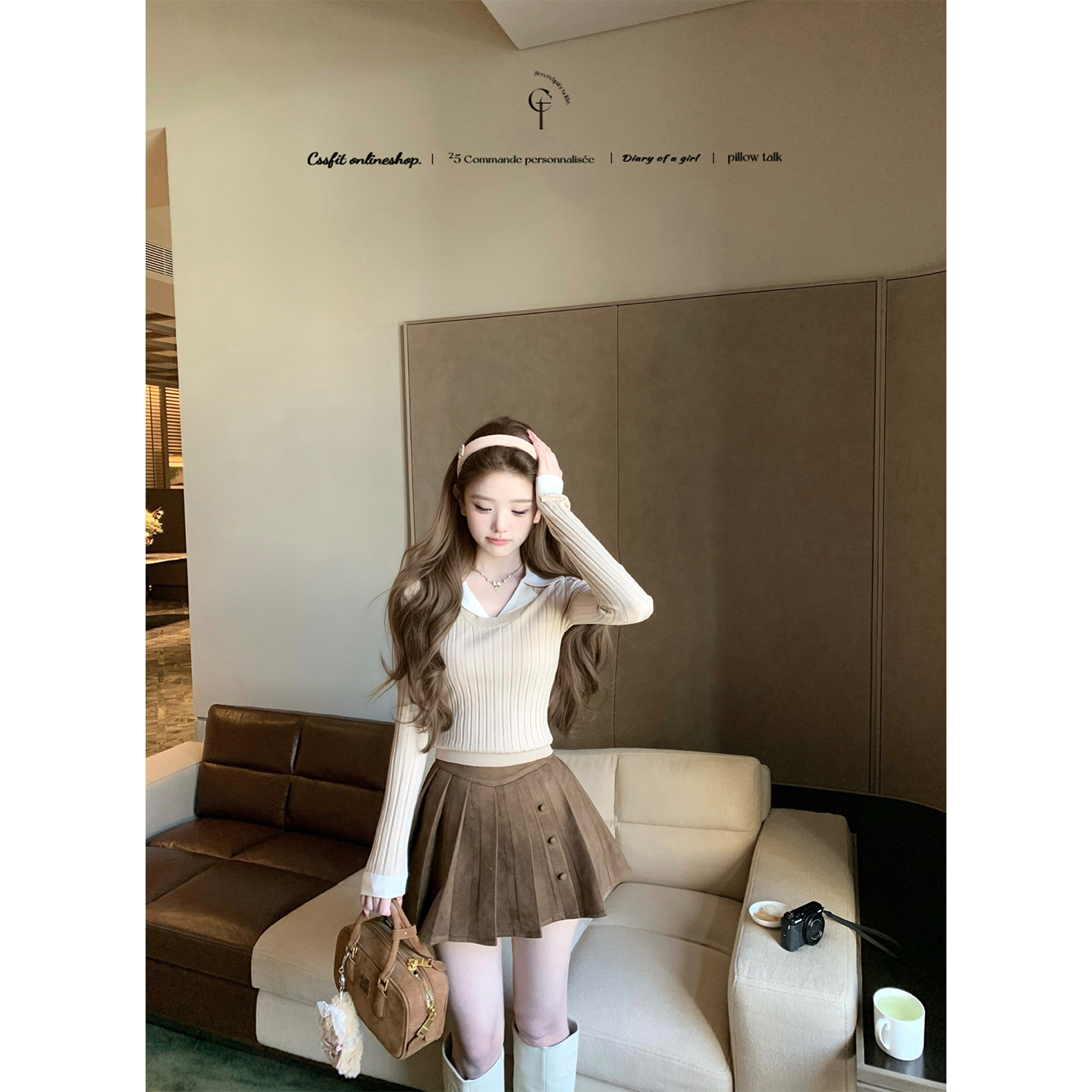 迟伞伞25/fw 可露丽拿铁 浅卡其假两件坑条针织衫麂皮百褶裙套装