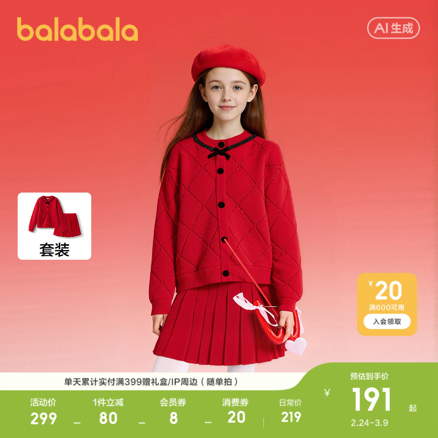 巴拉巴拉女童针织套装中大童裙子两件套儿童红色毛衣冬装新款童装