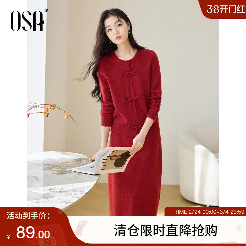OSA欧莎新中式红色针织套装2025年秋季新款女国风上衣半裙两件套
