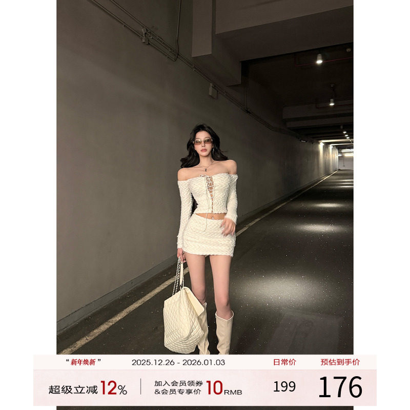 福尔尼斯悦 辣妹针织套装2025冬季毛圈拼接一字肩上衣半裙两件套