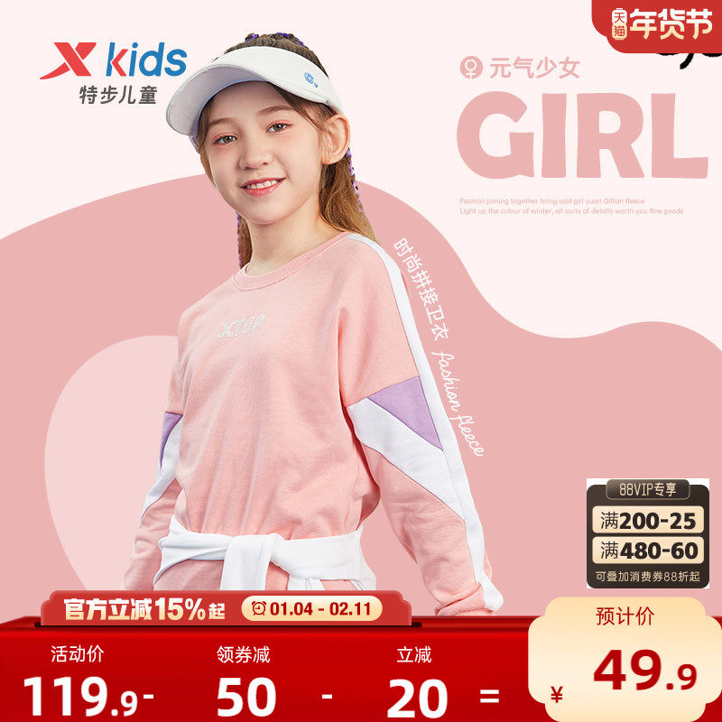 特步童装女童加绒卫衣儿童2025秋冬新款拼接大童长袖圆领上衣衣服