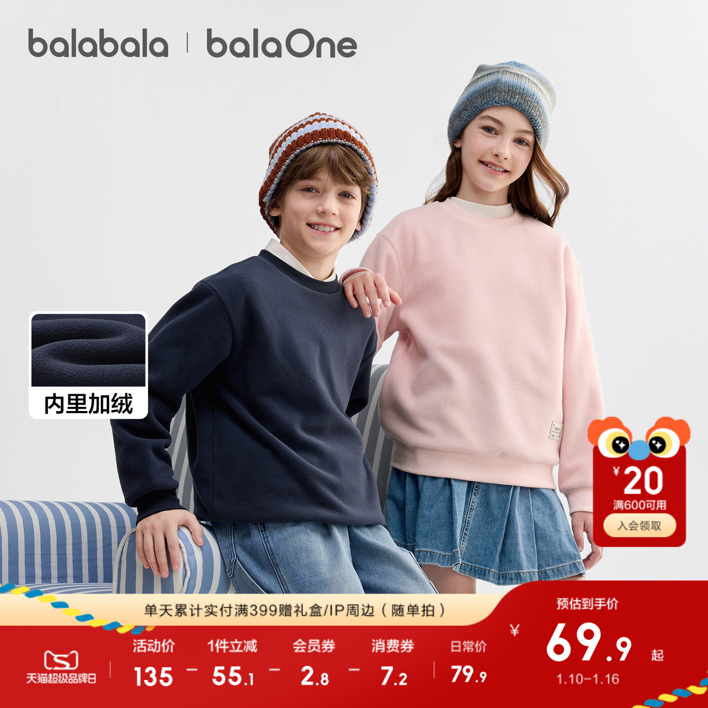 【balaOne】巴拉巴拉童装儿童卫衣男女童2025新款秋冬装加绒上衣