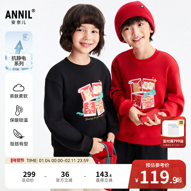 安踏儿童卫衣加绒男童| 2025年秋冬新款女童红色新年运动保暖上衣