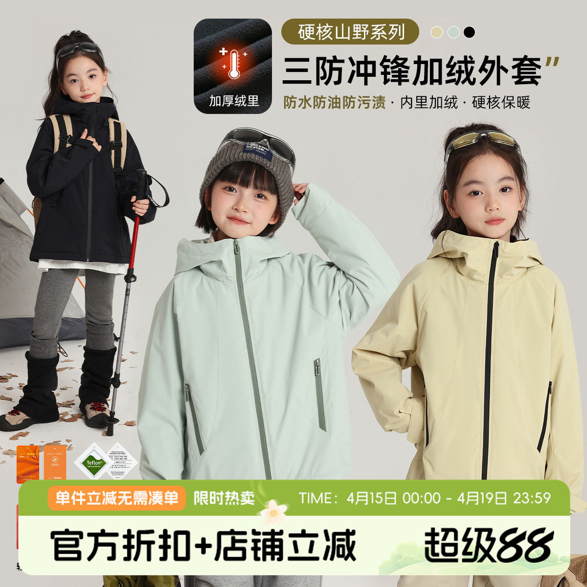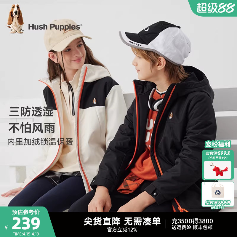 暇步士童装儿童加绒风衣秋冬装新款男童三防加厚保暖女童加厚外套